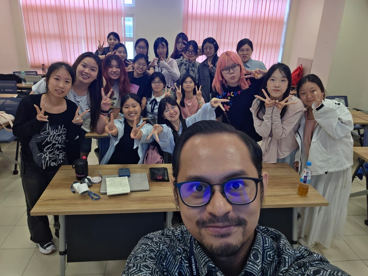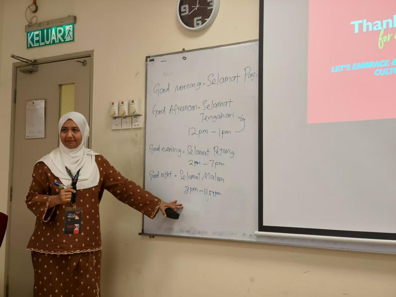 不仅如此,同学们在欢笑中体验马来西亚传统游戏——Congkak(马来播棋)的策略博弈智慧,Batu Seremban(五粒石)的手速挑战、瓶盖弹射的精准比拼——老师通过传统游戏向我们传递了马来西亚人民的生活智慧和文化积淀。老师的马来语入门课,从发音到文化背景,让同学们在“Apa khabar?”的问候中拉近了与当地人的距离。课程结束时的合影,定格了这段短暂却珍贵的师生情谊。、